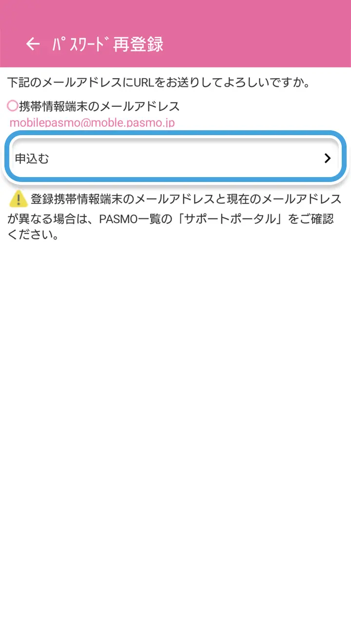 【パスワード再登録】画面で【申込む】をタップしてください。