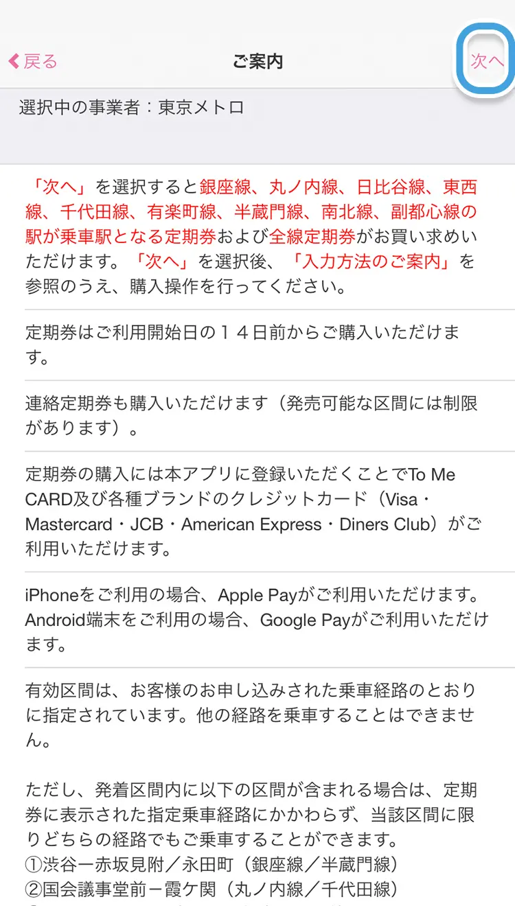 【定期券利用駅検索】画面で、乗車駅・降車駅を選択した後、乗換駅・経路を選択し【次へ】をタップしてください。